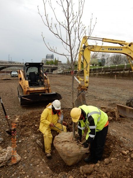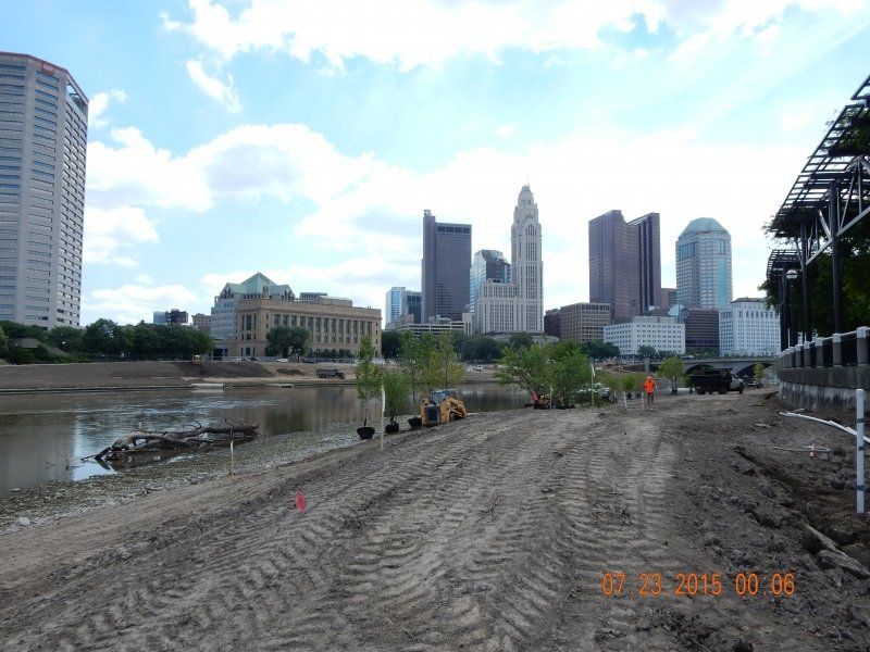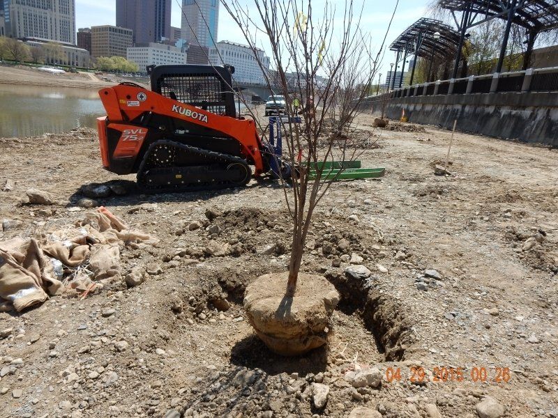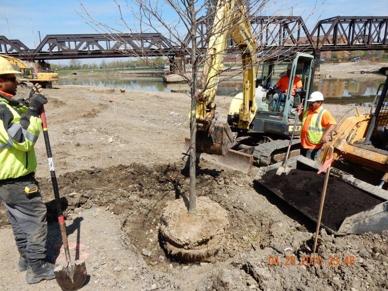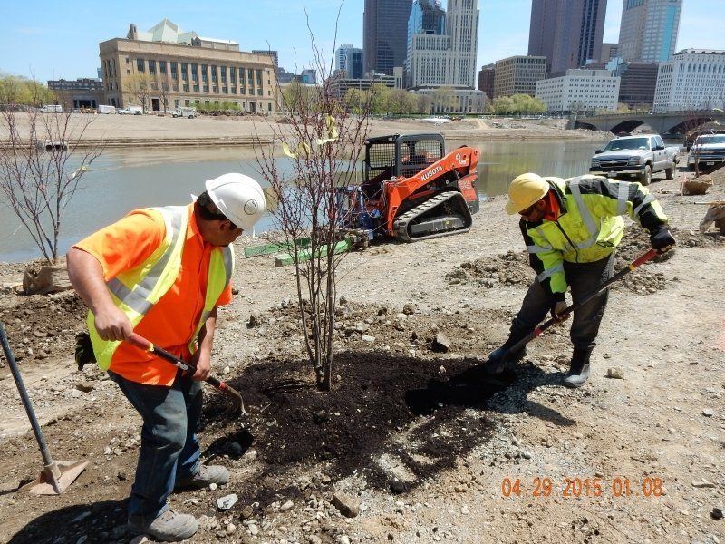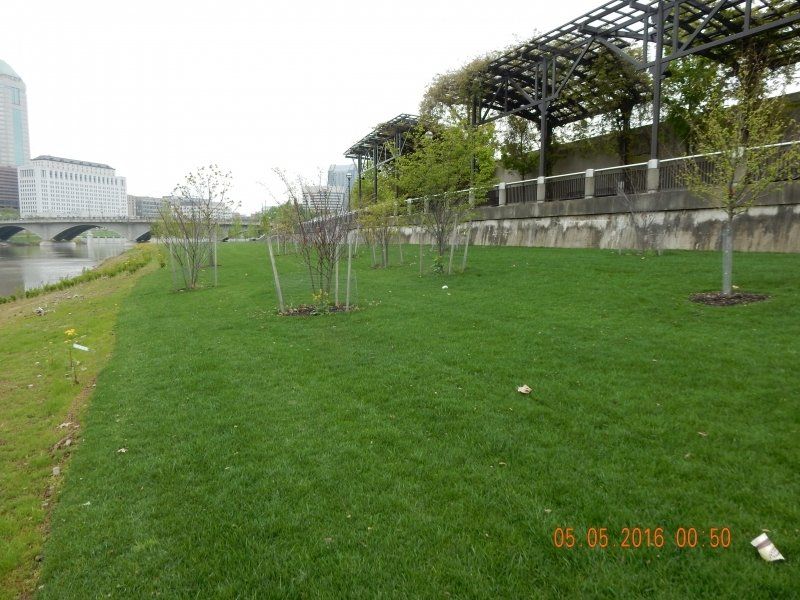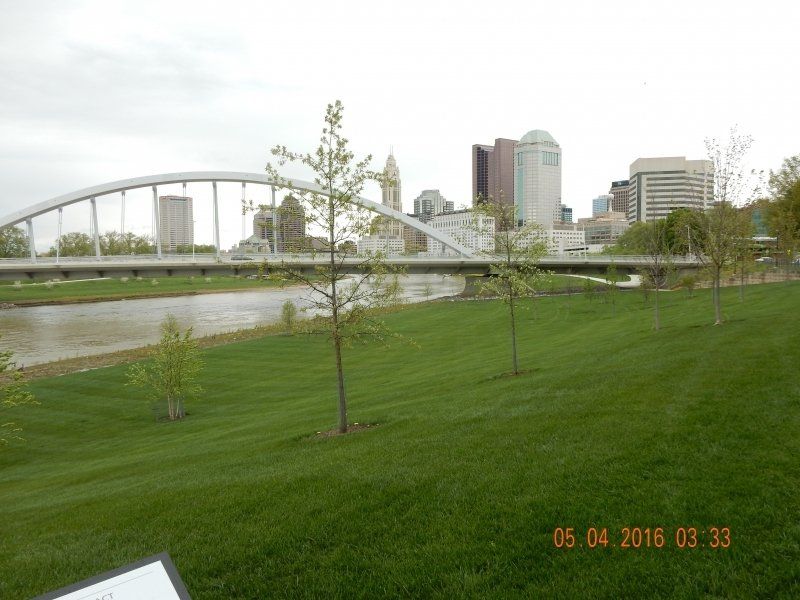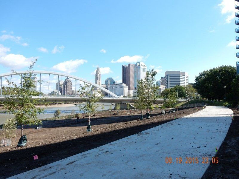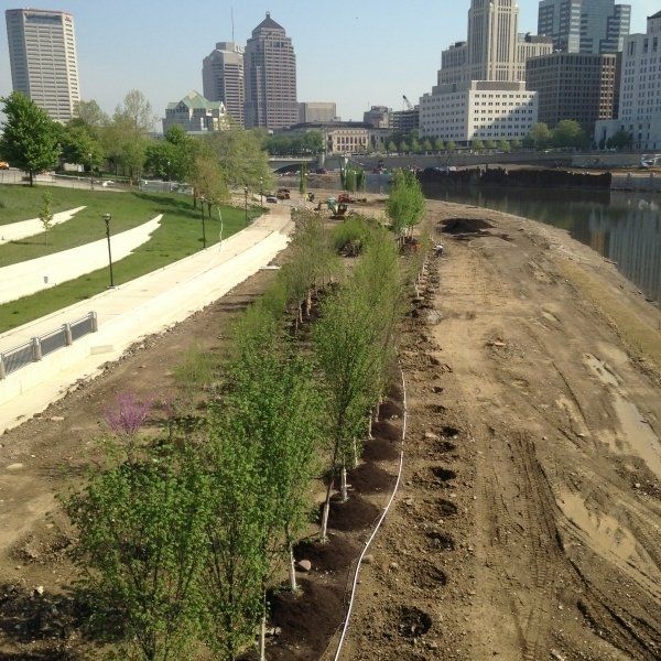 The Scioto Greenways Project, a part of the City of Columbus Scioto Mile development, is an award-winning multifaceted infrastructure and greenspace project along the banks of the Scioto River in downtown Columbus. After removal of the Main Street dam in 2013, 33 acres of new land (formerly underwater) along both sides of the river were developed into new green space/parkland. The project was completed and dedicated in November 2015. Our role was related to the 800 new trees installed. We inspected the trees at eleven nurseries, ensuring the nursery stock conformed to the ANSI (American National Standards Institute) Z60.1 Nursery Stock Standard (2014). Trees were then received to ensure proper nursery stock shipping/delivery and procedures were followed to ensure tree condition/health was satisfactory upon arrival. We trained the installation crews and directly oversaw a portion of the installations ensuring quality control and compliance with the ANSI A300 part 6 (transplanting) standard (2012). Spring of 2016 has revealed a very high survival rate for the 800 newly installed trees. On-going work with this project includes pruning and troubleshooting any specific issues that arise. The City of Columbus will officially assume care of the trees in November, 2016. Read more here.